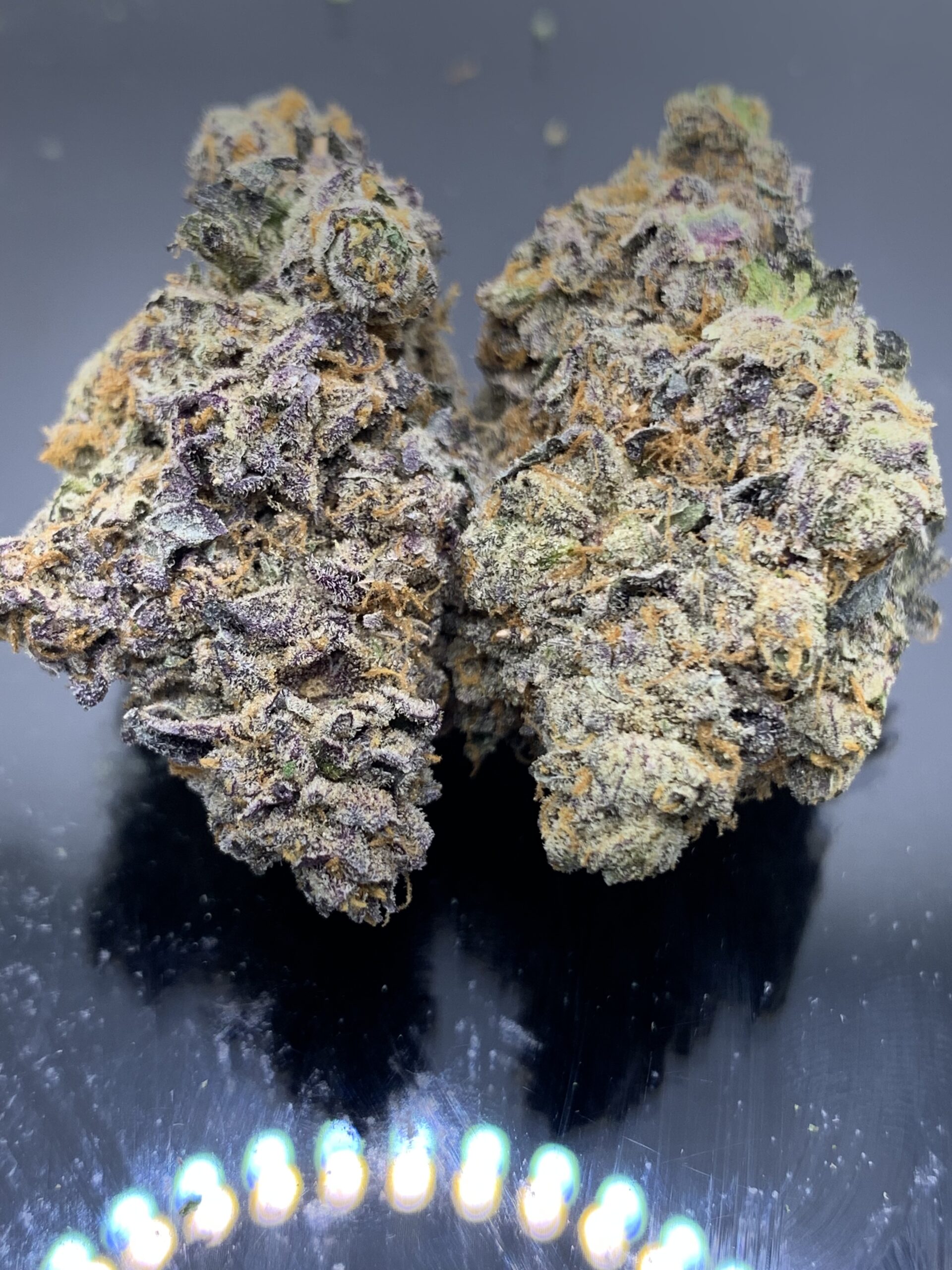 Raspberry Storm is an evenly balanced hybrid strain (50% indica/50% sativa) created through crossing the delicious (GMO X Slurricane) X Slurricane strains. Named for its amazing flavor and blistering parentage, Raspberry Storm is one weather event that you’ll want to get caught in. The taste will hit your tongue as soon as you exhale, filling your mouth with sweet sugary raspberries and zesty citrus. The aroma is just as bright, with a punch of sour citrus and blue raspberry candies dancing throughout the air. The Raspberry Storm high will hit your brain quickly, infusing you with a hazy sense of lifted euphoria. You’ll find that you’re feeling a bit out of touch with reality and super giggly, prone to uncontrollable fits of laughter for no reason at all. A light sense of physical calm accompanies this mental haze, keeping your body relaxed from start to finish. Thanks to these effects and its insanely high 34% average THC level, Raspberry Storm is often chosen to treat chronic stress or anxiety, PTSD, nausea or appetite loss and depression or mood swings. This bud has fluffy and small, heart-shaped forest green nugs with lots of super thin orange hairs and chunky, amber-tinted white crystal trichomes.