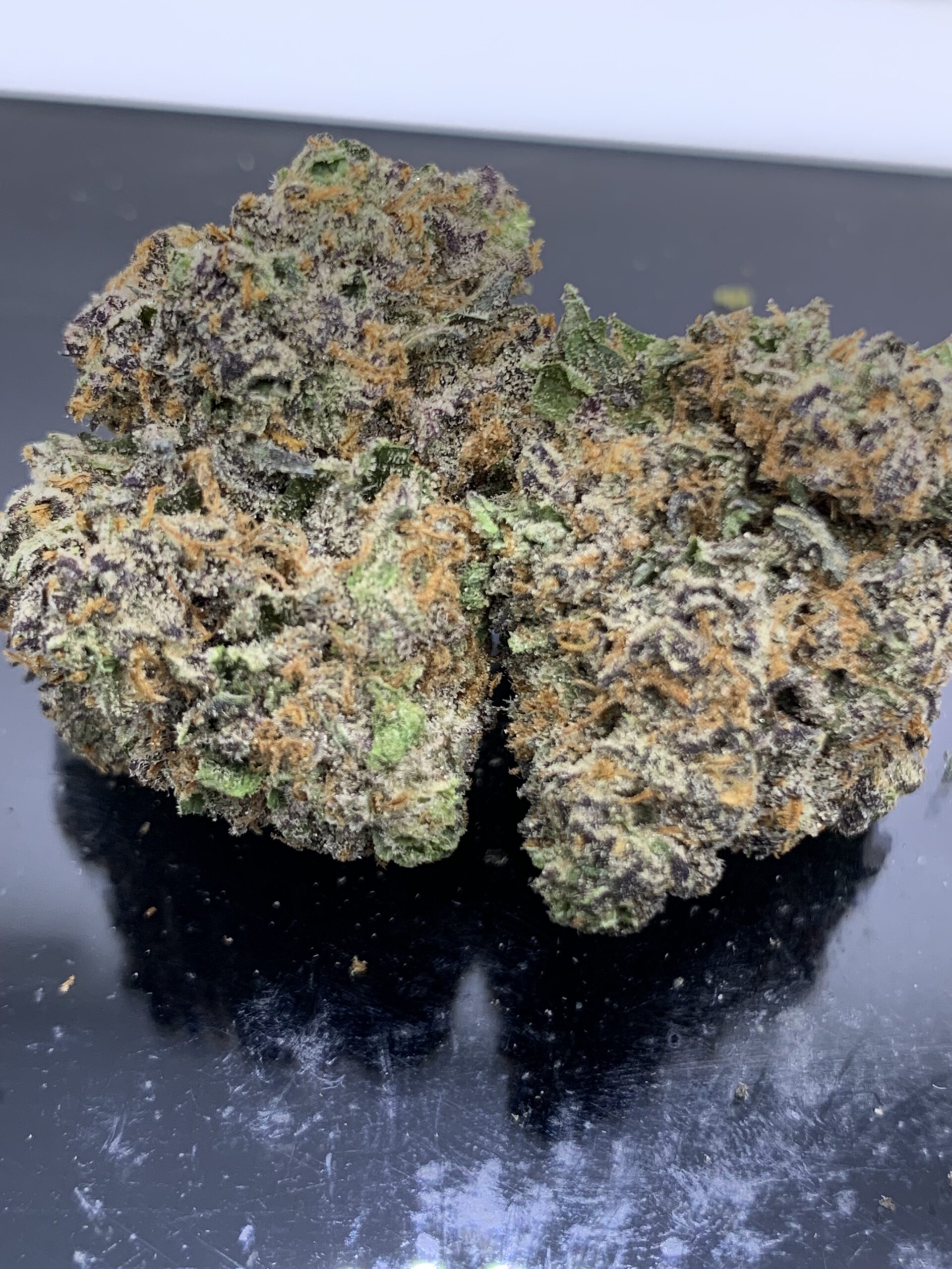 Red Bubblegum, also known as “Red Bubble Gum,” is an evenly balanced hybrid strain (50% indica/50% sativa) created through crossing the potent White Runtz X Jet Fuel Gelato X Zeclair strains. This tasty treat packs a boatload of full-bodied effects that will numb both mind and body, leaving you utterly stoned from head to toe for hours and hours on end. The high will begin behind the eyes, filling them with a heavy weight that has you feeling like you can’t focus on much of anything. As your eyes droop, this heaviness will creep its way into your brain, leaving you happy and completely out of touch with reality. A calming physical high accents this heady stone, helping your body to keep settled from start to finish. With these long-lasting effects and its insanely high 27-35% average THC level, Red Bubblegum is often suggested to treat experienced patients suffering from conditions such as chronic stress or anxiety, appetite loss or nausea, depression or mood swings, chronic pain and eye pressure or glaucoma. This bud has a sweet and sugary strawberry bubblegum candy taste with a creamy vanilla exhale. The aroma takes it up a notch, adding in layers of rich diesel and flowery herbs. Red Bubblegum buds have dense triangle-shaped olive green nugs with dark purple leaves, thin red-orange hairs and tiny, dark purple-tinted white crystal trichomes.